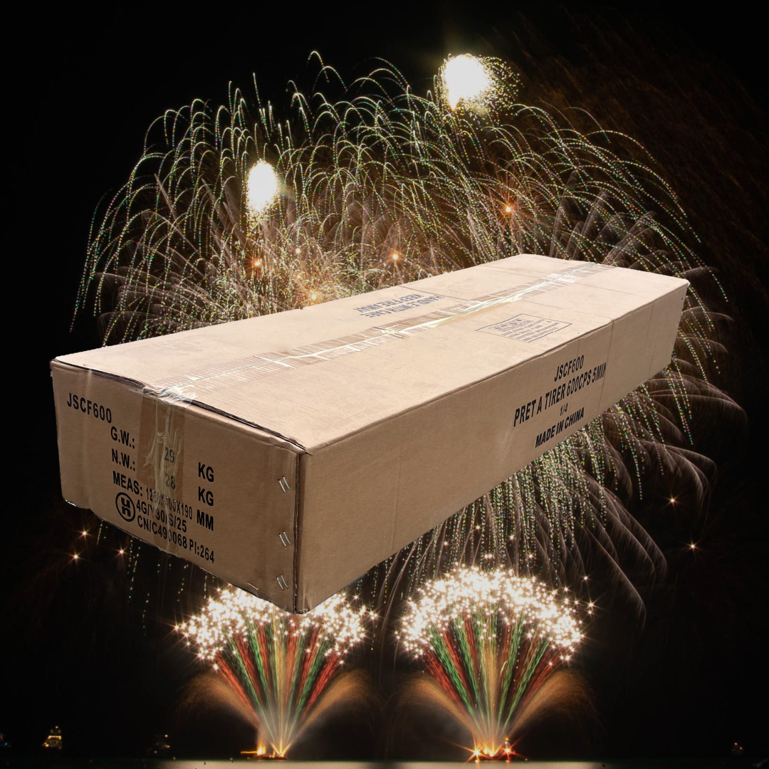 Le JSCF 600 est un feu d’artifice prêt à tirer de 600 coups au calibre 20 et 25 mm, offrant un spectacle continu d’environ 4 minutes qui garantit un rendu professionnel spectaculaire, accessible à tous les publics.